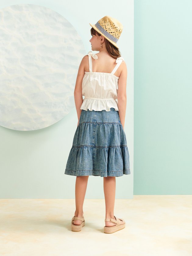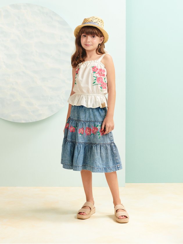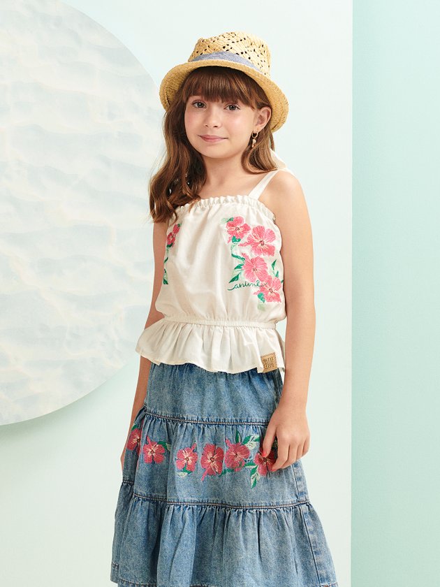 Confeccionada em tecido plano a blusa Animê conta com design fashion e bordado de flores na parte frontal, faz combinações com saia, short ou calça de forma única e estilosa. Mães e filhas vão se apaixonar por essa blusa com detalhes pra lá de especiais, dentre eles a peça traz elástico na cintura, alças para fazer laço no ombro e etiqueta decorativa costurada na barra. Composição: 55% algodão e 45% poliéster. Ref.: N2329