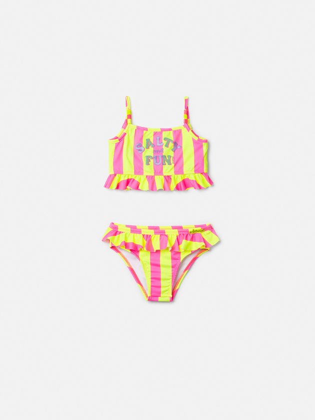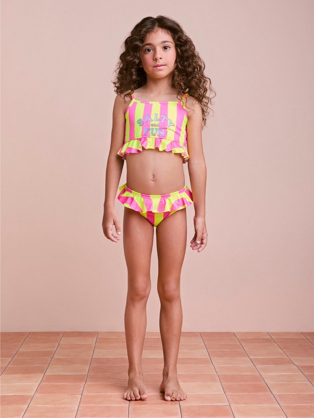 O biquíni infantil Animê traz todo o charme e energia do verão com suas listras vibrantes em pink e amarelo. A peça conta com babadinhos delicados na barra e detalhe frontal com a frase Salty and Fun, que traduz o clima leve e descontraído da estação. Confeccionado em tecido confortável e de secagem rápida, garante liberdade de movimento para as pequenas aproveitarem cada momento na praia ou na piscina.