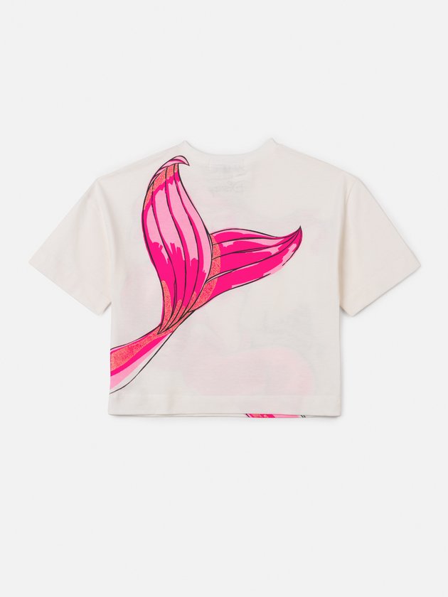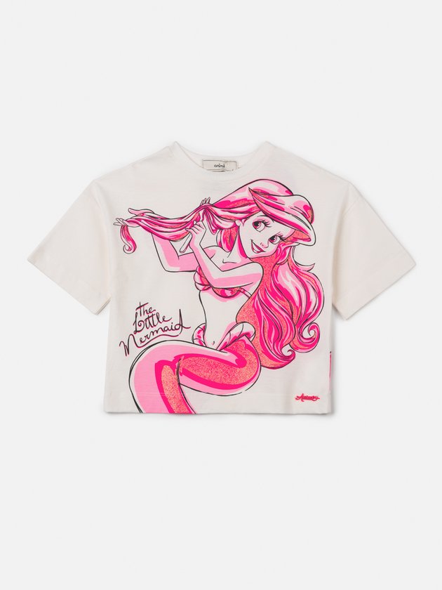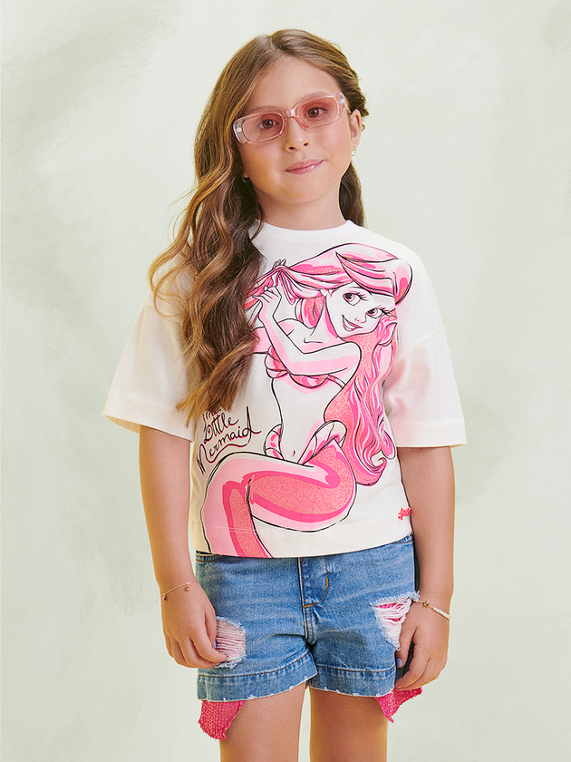 Esta t-shirt de meia malha para menina é uma collab com a Disney, apresentando uma estampa vibrante inspirada na Pequena Sereia. Com seu rosa neon chamativo, é perfeita para combinações modernas e divertidas. A plaquinha decorativa adiciona um toque de charme extra à peça. Ideal para as fãs da Disney que adoram um estilo fashion e colorido. Composição: 100% algodão. Ref.: N3514
