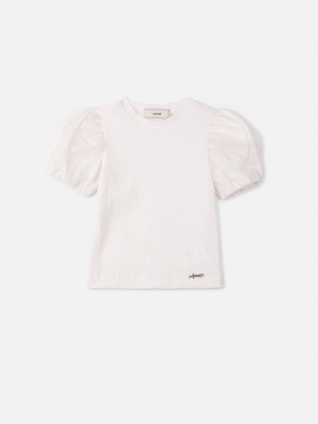 Clean, comfy e chic. A blusa off white canelada é essencial para produções sofisticadas e funcionais, com destaque nas mangas de tule, ideal para sobreposições e looks versáteis. O toque macio e o caimento ajustado valorizam o visual com leveza.
