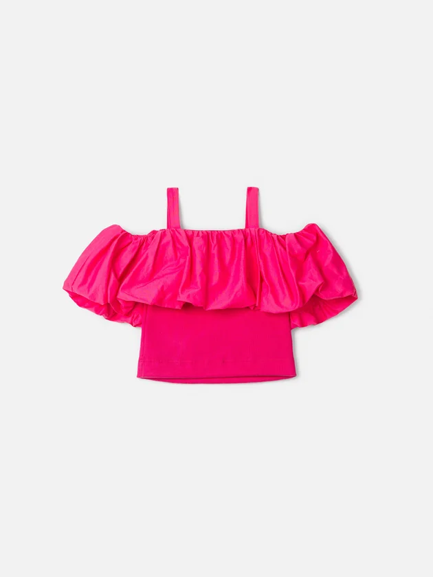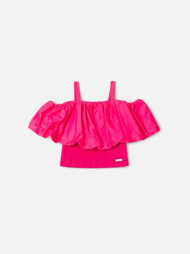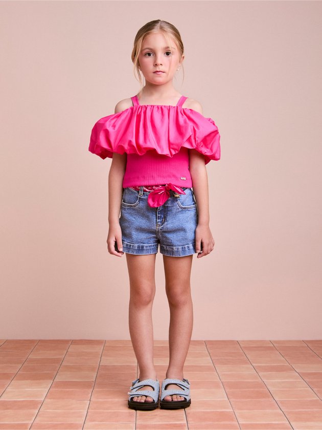 A Blusa Infantil Pink Balonê é puro protagonismo no look. Com modelagem estruturada, apresenta alças médias, decote reto e um babado amplo em efeito balonê que traz volume e movimento à parte superior, criando um visual moderno e sofisticado. A base ajustada proporciona conforto e melhor sustentação ao vestir. Confeccionada em tecido leve com acabamento impecável, combina estilo e praticidade. O tom pink vibrante reforça a proposta fashionista da peça, ideal para produções elegantes, festas ou composições urbanas cheias de atitude. Ref.: N4875