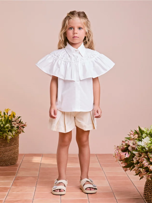 A camisa infantil Miss Animê une elegância e modernidade em um só design. Confeccionada em tecido leve, traz gola clássica e babado maxi aplicado nos ombros e busto, que adiciona movimento e sofisticação à peça. O detalhe da marca bordada na pala reforça o DNA fashion exclusivo da Animê. Versátil e charmosa, pode ser usada tanto em ocasiões especiais quanto em looks casuais com um toque refinado. Combine com saias rodadas, Short de alfaiataria ou jeans para garantir um visual atual e sofisticado.