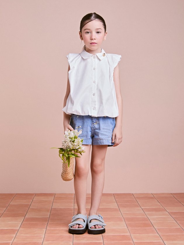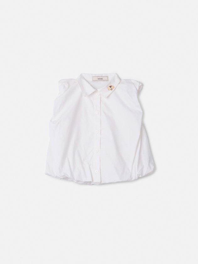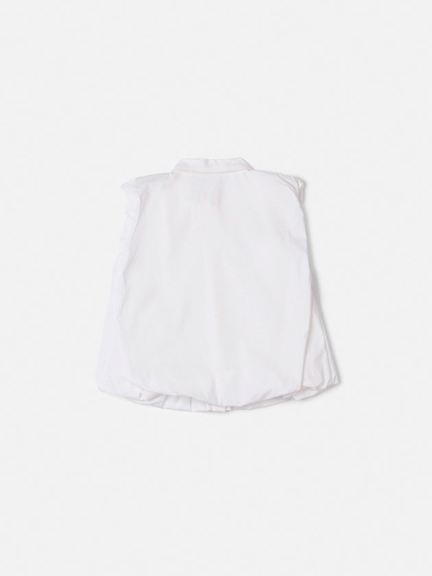 Camisa branca sem mangas com gola tradicional e botões frontais. Tem um corte amplo com franzidos na barra, conferindo volume e um visual moderno. Possui um pequeno broche dourado decorativo no colarinho.