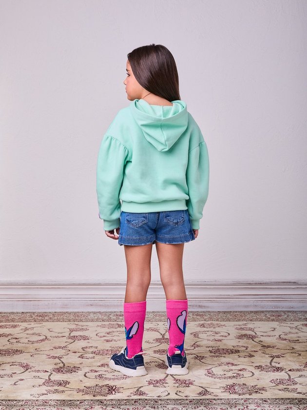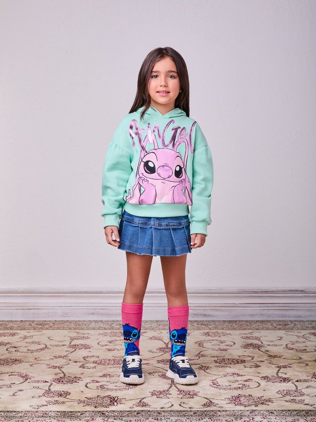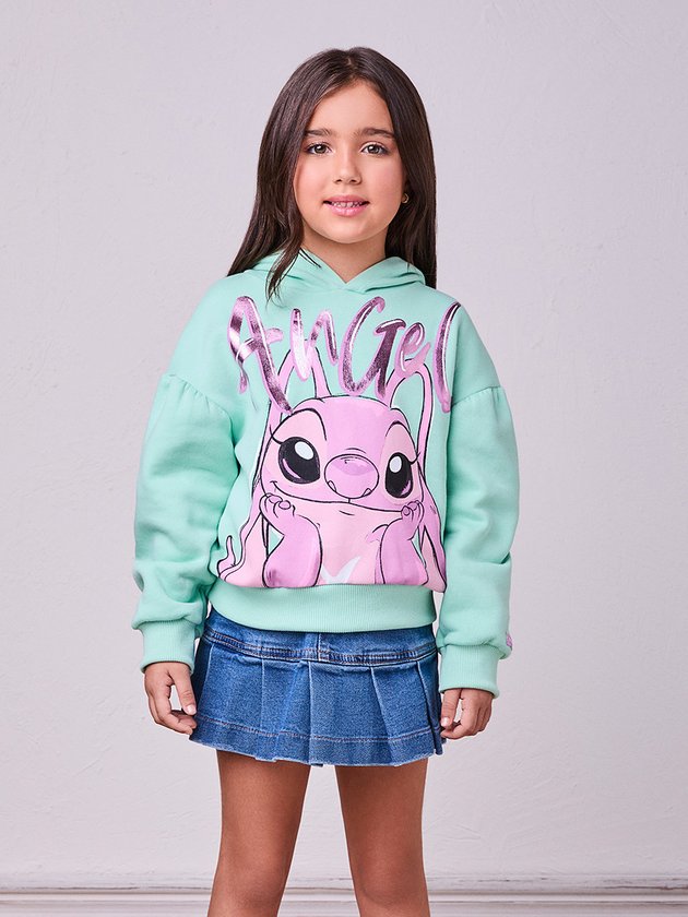 Para as fãs da personagem mais charmosa de Lilo & Stitch! O moletom verde menta com estampa da Angel e escrita metalizada rosa é puro charme. Ideal para dar um up nas produções de inverno com toque divertido e fashion. Ref.: N4845