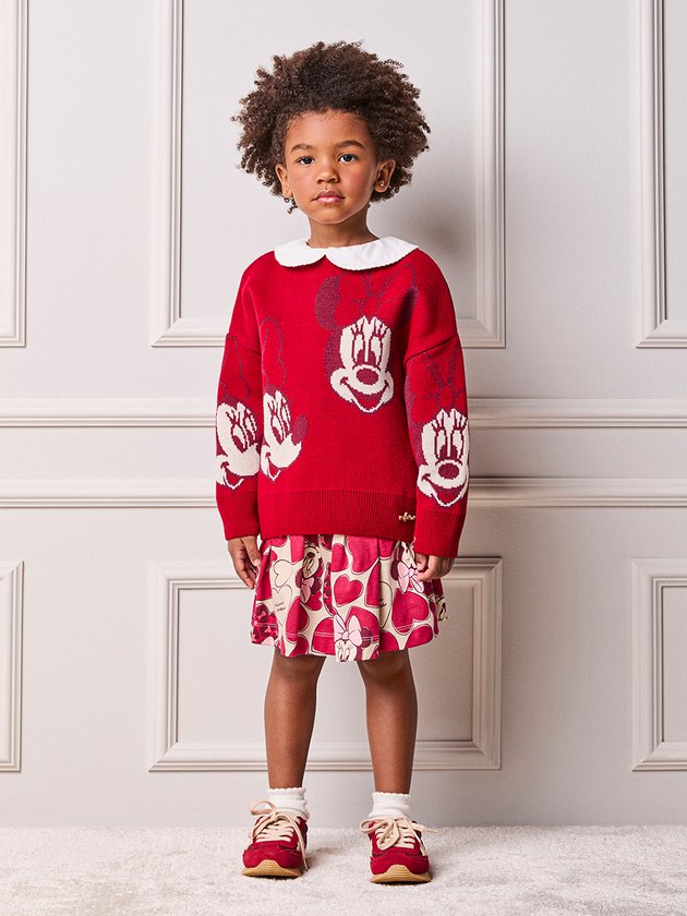 Cor intensa, leitura sofisticada e narrativa bem resolvida. O tricot em vermelho cherry entrega impacto imediato e aquece o visual com elegância. A Minnie aparece integrada de forma estilosa, longe do óbvio, funcionando quase como assinatura gráfica. A textura do tricot cria profundidade e um caimento confortável, ideal para produções de inverno que pedem presença sem exagero. Funciona perfeitamente com saias de tweed, jeans ou peças neutras, equilibrando cor e design. Uma peça protagonista, pensada para quem gosta de moda com personalidade e acabamento premium. Ref.: P6426