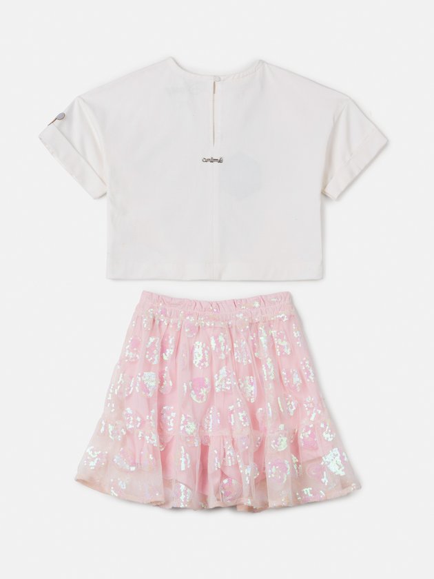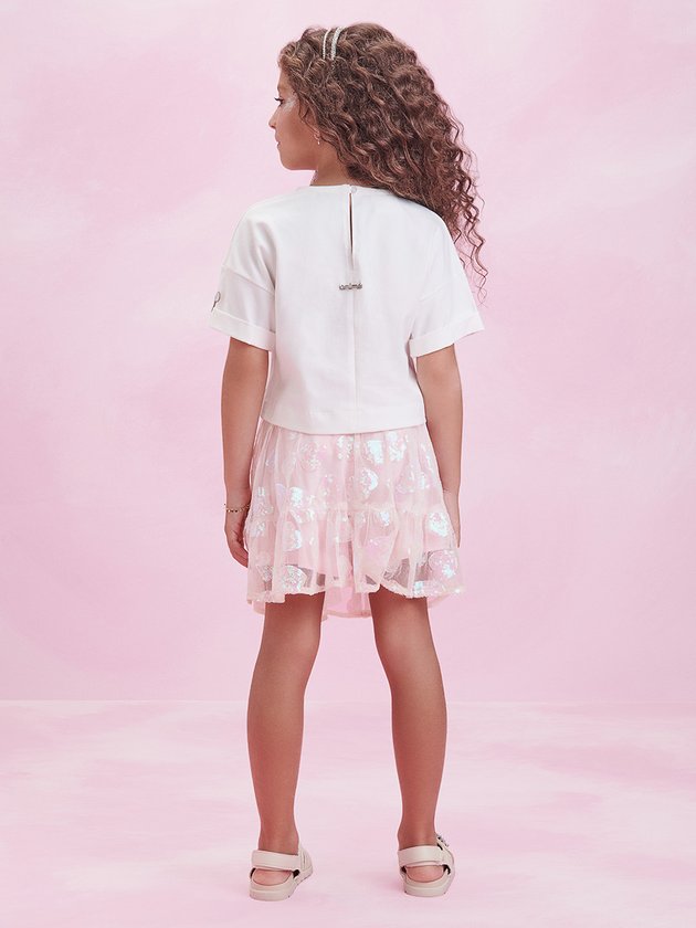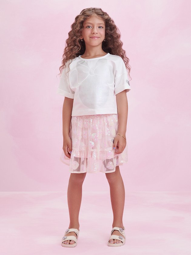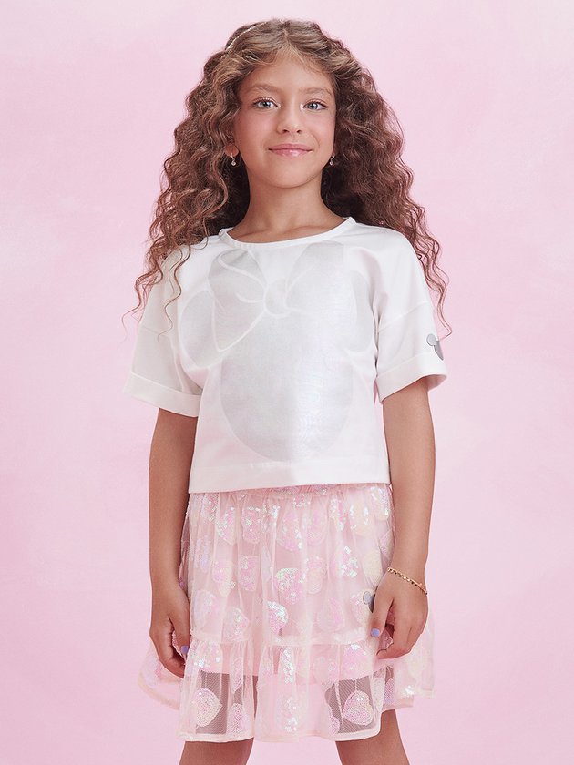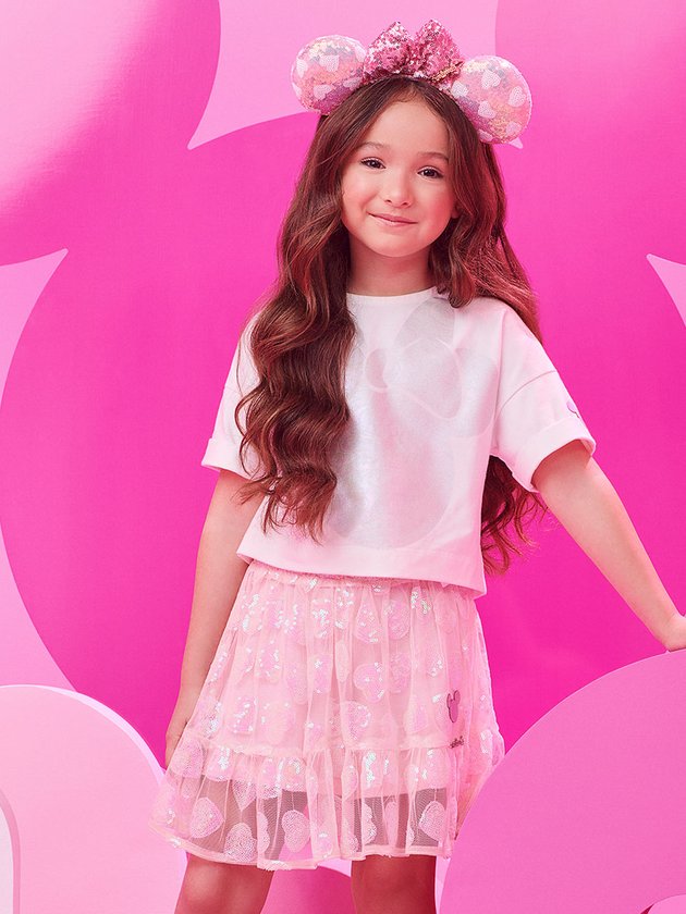Coleção exclusiva em comemoração aos 100 anos da Disney, trouxe peças com visual único e muito brilho. O conjunto infantil Animê é composto por blusa e saia, perfeito para as pequenas fashionistas. A blusa é feita em malha confortável, enquanto a saia possui camadas de tule com forro de malha macia. Com elástico no cós para um ajuste perfeito, a saia apresenta um lindo bordado de paetês, adicionando um toque de brilho ao visual. Esse conjunto encantador combina conforto e estilo, deixando as meninas prontas para arrasar! Composição - Blusa: 100% algodão. Saia: 100% poliéster. Forro: 100% algodão. Ref.: N3483