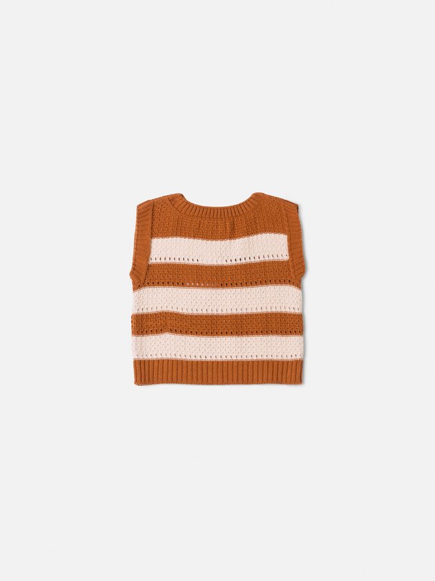 Este colete aposta no grafismo clássico reinterpretado com olhar contemporâneo. As listras criam ritmo visual e reforçam a identidade fashion da peça, enquanto o tricot encorpado garante estrutura e acabamento sofisticado. O design limpo valoriza sobreposições elegantes, funcionando como elemento-chave para composições modernas e bem construídas. Uma peça versátil, que adiciona informação de moda ao look com equilíbrio, presença e estética premium. Ref.: N5544
