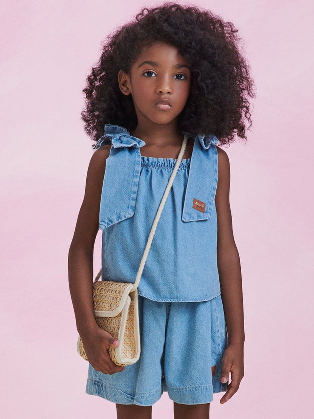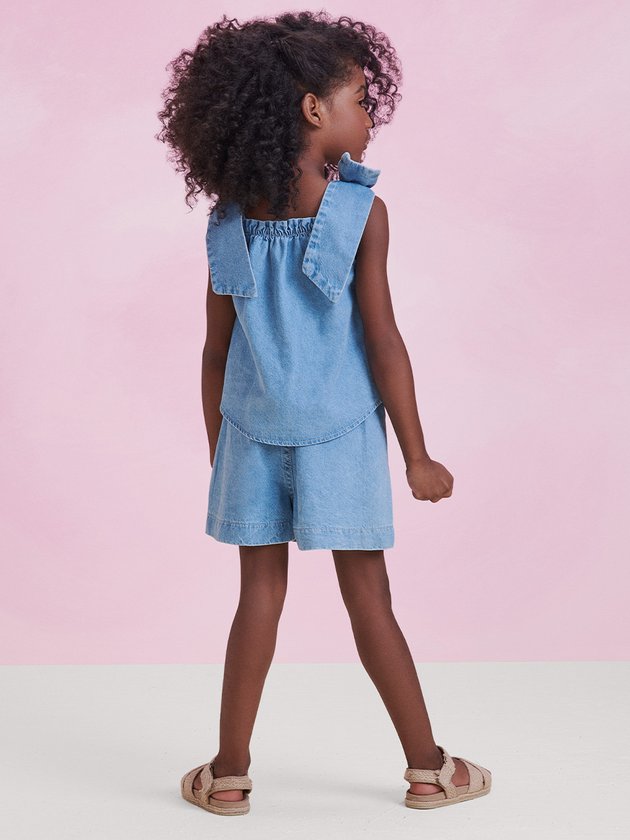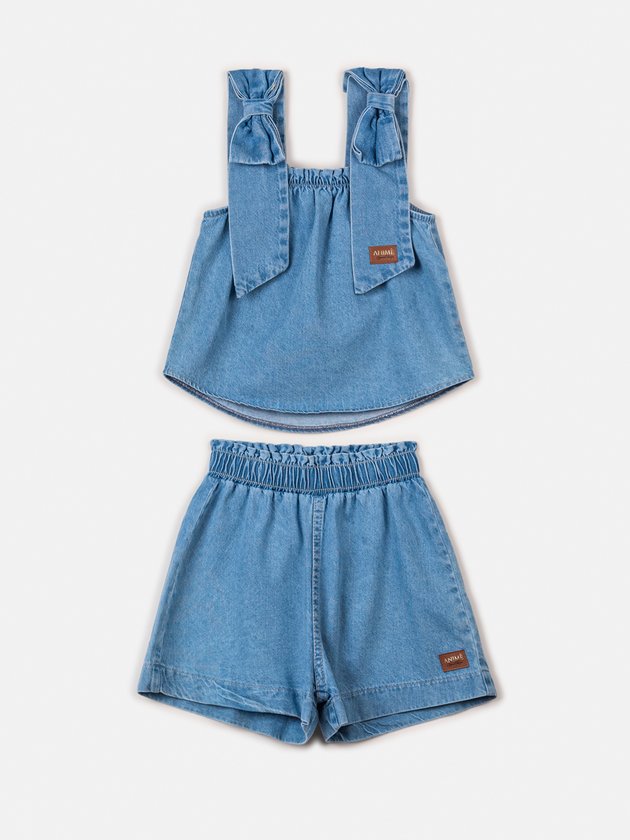 O conjunto jeans é composto por blusa e um short, trazendo o visual fashion e irresistível da Animê. Com laço fixo no ombro, o conjunto é uma combinação perfeita de estilo e conforto. A etiqueta decorativa da marca confirma a qualidade e originalidade da peça. Ideal para almoços em família e viagens, esse conjunto é versátil e prático. Deixe sua menina arrasar com esse conjunto incrível, proporcionando um visual encantador em qualquer ocasião. Composição: 100% algodão. Ref.: P5413