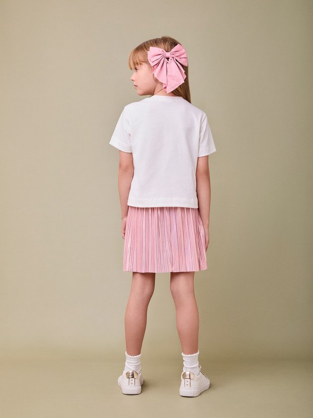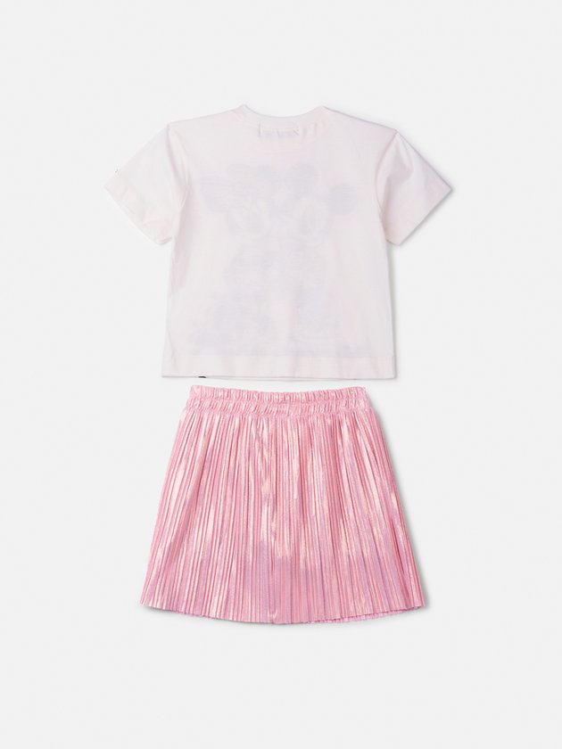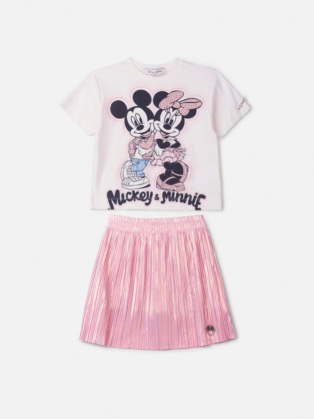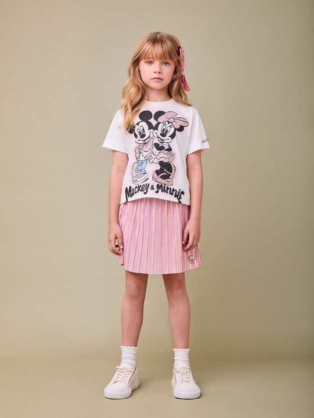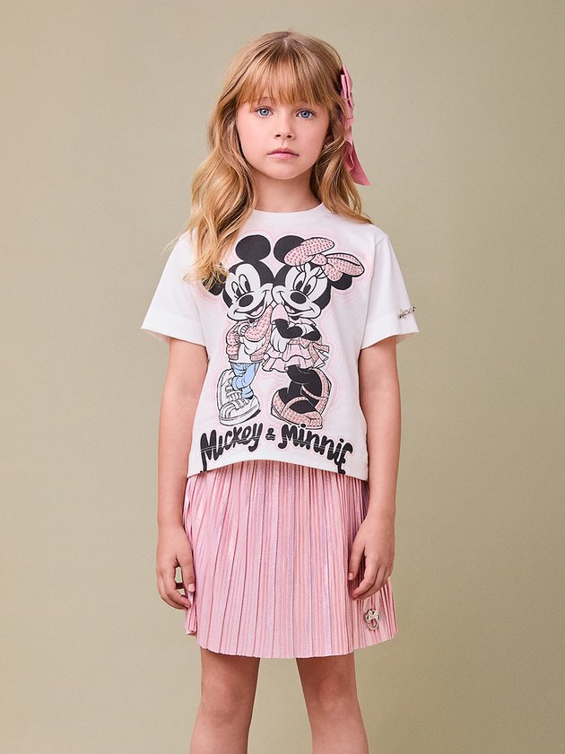 O duo mais querido da Disney aparece em um conjunto cheio de personalidade! A t-shirt off white traz Mickey & Minnie em uma estampa divertida com aplicações que brilham, e a saia plissada rosa metalizada finaliza o look com um toque glam.