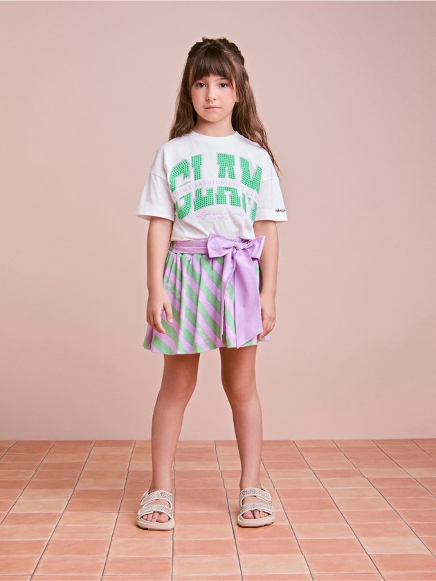 Inspirado no estilo glam, esse conjunto aposta nas listras com brilho e no toque fashion do maxi laço centralizado na blusa. A saia em tule com sobreposição garante movimento e delicadeza. Um look digno de fashionistas mirins. Ref.: N5254