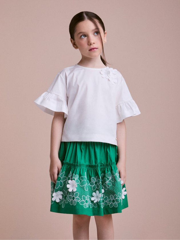 O conjunto Animê combina delicadeza e modernidade em uma produção cheia de frescor. A blusa branca traz mangas com babados e aplicação floral em relevo, garantindo sofisticação ao visual. Já a saia verde com bordados de flores brancas é o destaque da peça, trazendo movimento e alegria para o look. Confortável e fashion, é perfeito para ocasiões especiais ou passeios de verão. Aposte em sandálias ou tênis brancos para um visual leve, encantador e super estiloso.