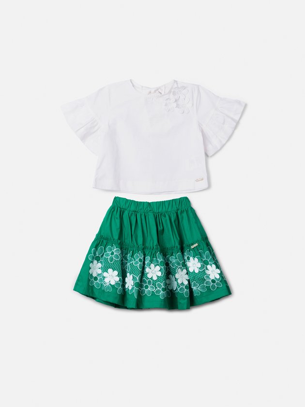 Sofisticado e atemporal, o conjunto em tricoline é realçado pelos bordados delicados da saia, que conferem romantismo e elegância à produção. A blusa clássica completa o visual com frescor e versatilidade. Uma peça perfeita para looks que equilibram conforto e sofisticação em qualquer ocasião. Ref.: N5665