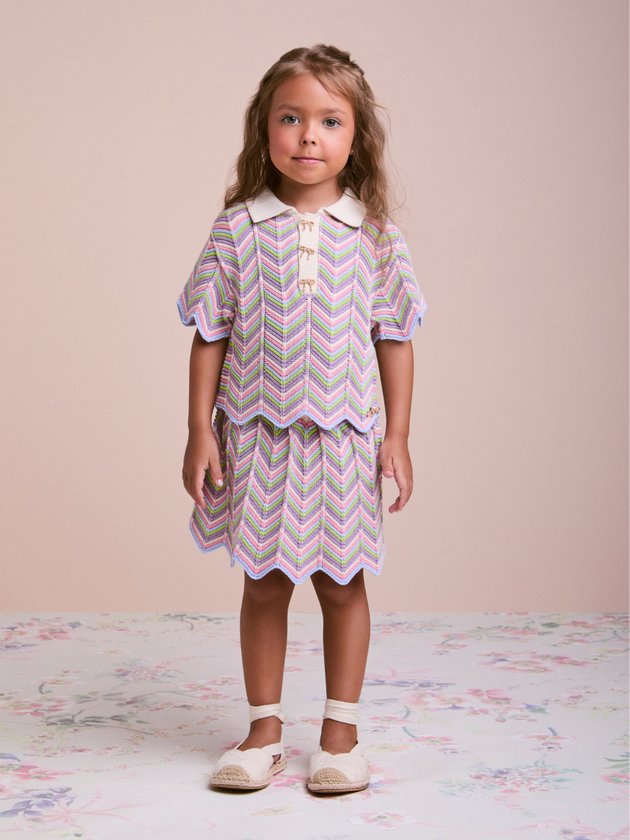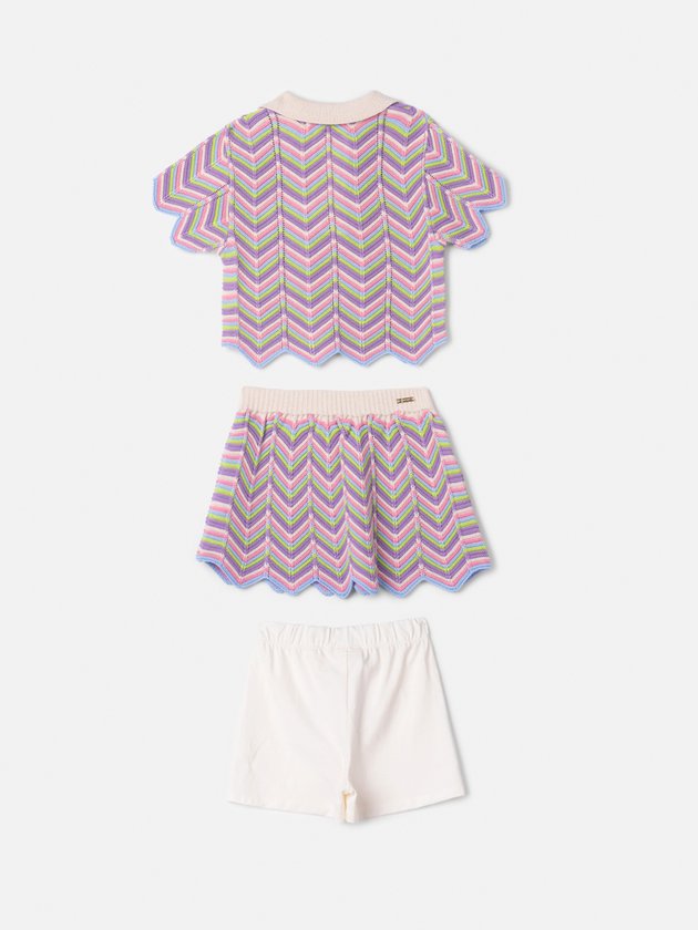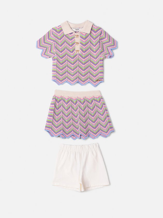 Este conjunto infantil em tricô é a escolha perfeita para unir conforto e sofisticação. Com estampa chevron em tons de lilás, verde e rosa, o modelo traz um visual moderno e encantador. A blusa possui gola polo com detalhe em botões delicados, enquanto a saia plissada dá movimento e estilo ao look. Uma produção charmosa e cheia de personalidade para as pequenas. Dica: combine com sandálias em tons neutros ou tênis branco para um visual fresh e atual.