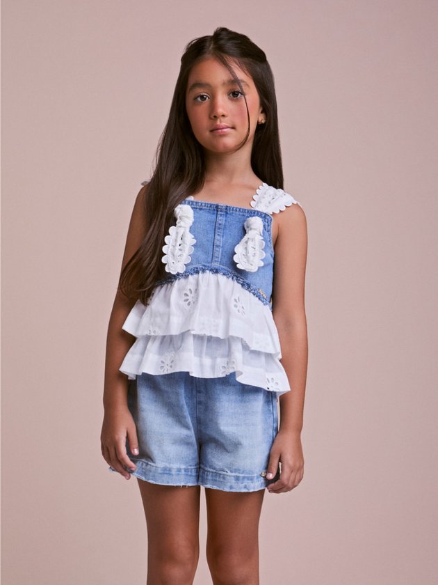 O conjunto Animê é a mistura perfeita entre estilo e delicadeza! A blusa jeans ganha charme extra com alças em bordado branco e camadas de babados com bordado inglês, trazendo romantismo e sofisticação. O short jeans completa o look com modernidade, oferecendo praticidade e conforto para todas as ocasiões. Ideal para passeios, festinhas ou momentos especiais, o visual pode ser finalizado com sandálias delicadas ou tênis casuais, garantindo um estilo autêntico e cheio de personalidade.