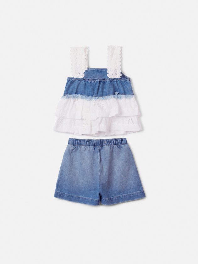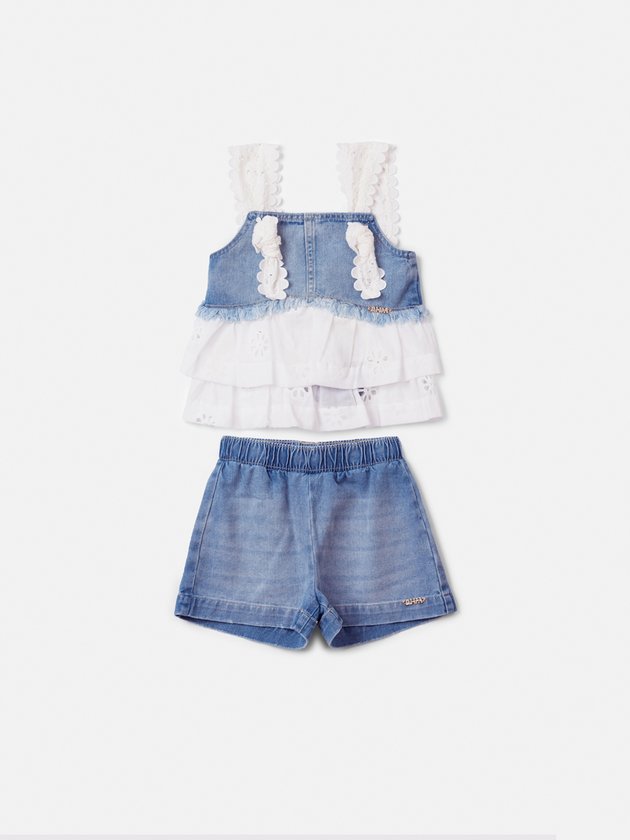 Delicado e moderno, o conjunto une a leveza da blusa com o charme do shorts jeans enriquecido com detalhes em laise. Uma produção que equilibra o frescor do jeans com a sofisticação artesanal, criando um look versátil e cheio de personalidade. Perfeito para composições casuais que pedem conforto e feminilidade em cada detalhe. Ref.: N5652