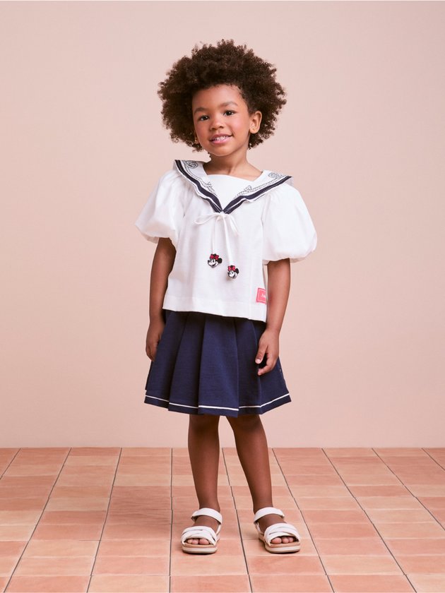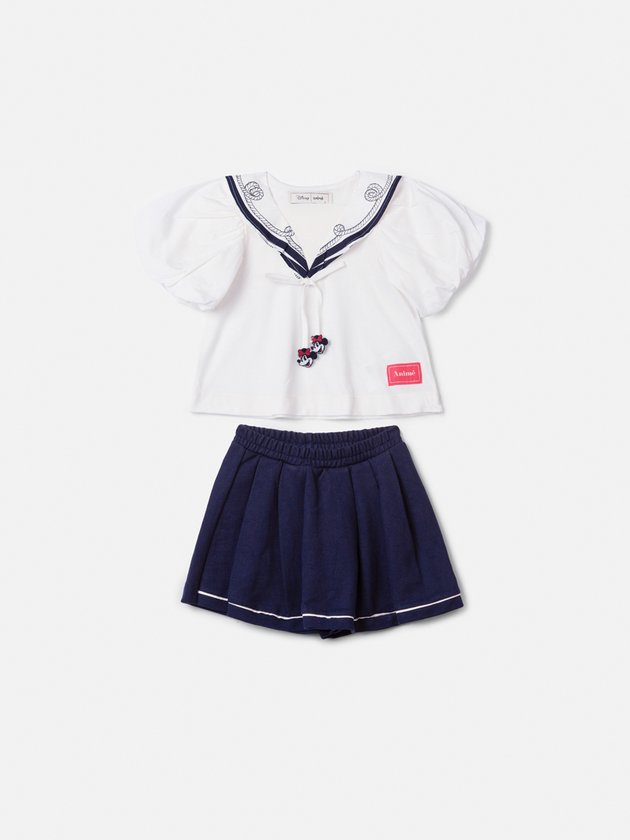 Este conjunto Animê é perfeito para unir moda e diversão! A blusa branca traz gola marinheiro com bordado navy, fitas com aplicações da Minnie Mouse e mangas bufantes que dão um ar delicado. Acompanha saia azul marinho com pregas e barra contrastante, garantindo movimento e estilo. Uma peça charmosa e confortável para diversas ocasiões. Dica: combine com tênis branco para um visual casual fashion ou sapatilha para um look mais arrumadinho.