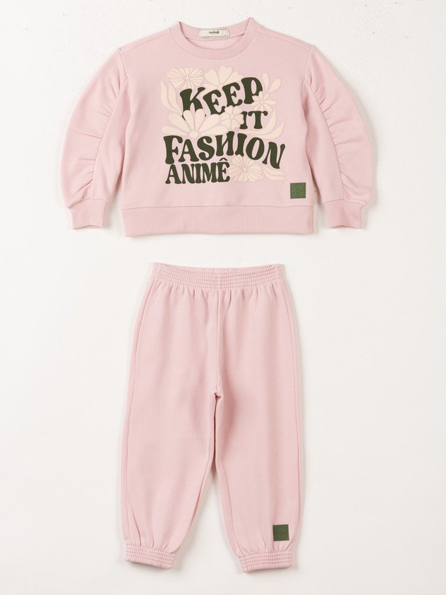 Charmoso e aconchegante, este conjunto de moletom rosa com mangas franzidas é ideal para o dia a dia. As mangas trazem um toque delicado, sendo perfeito para um visual casual e estiloso.