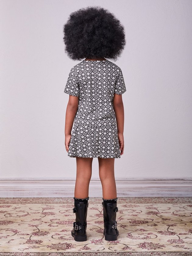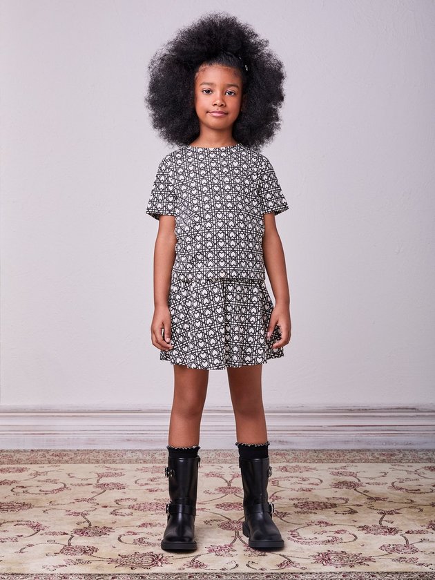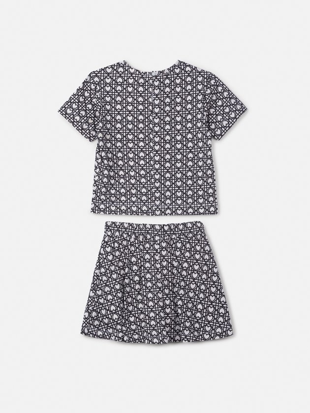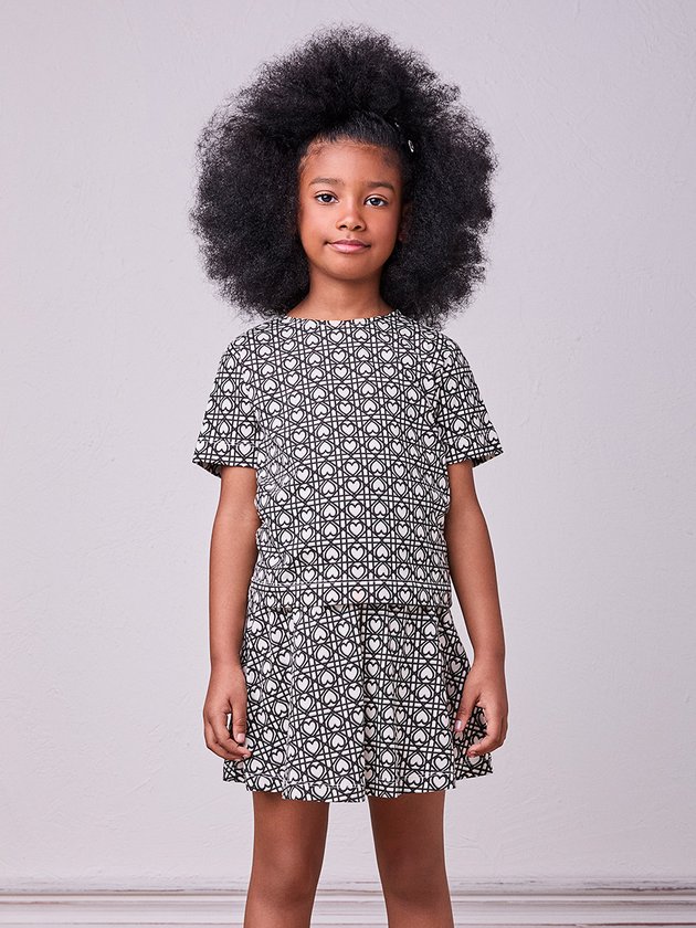 O mix de conforto e estilo que não pode faltar! O conjunto com estampa de monograma de corações em preto e off white é superversátil. Com modelagem ampla e saia em camadas, é perfeito para o dia a dia cheio de personalidade.