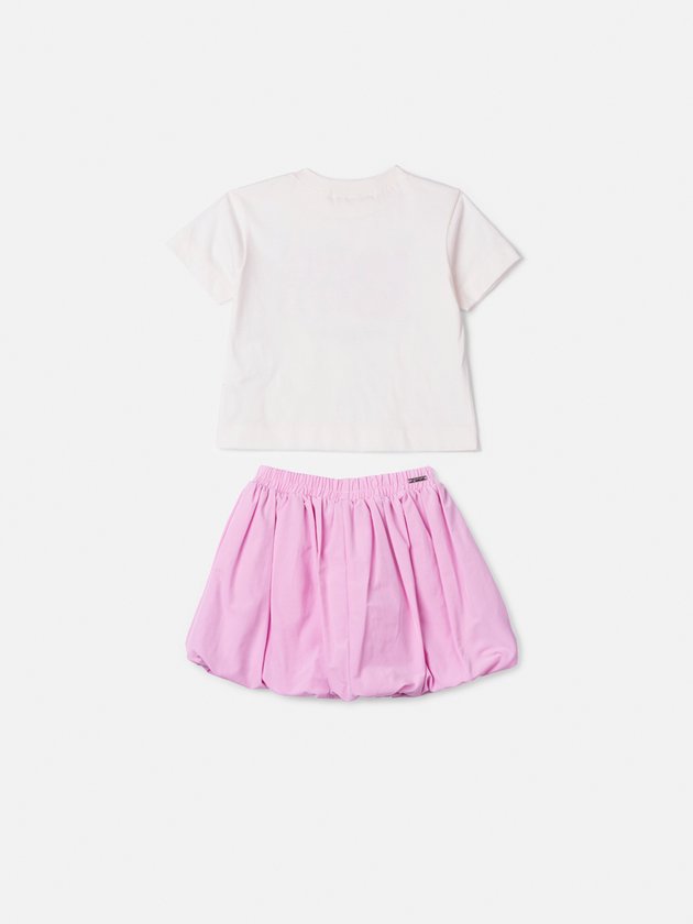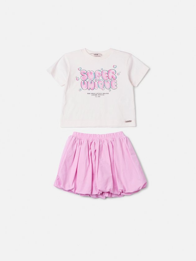 A blusa "Super Unique" ganha destaque com aplicações brilhantes e modelagem soltinha, enquanto a saia rosa balonê traz textura e volume com leveza. Um look autêntico e moderno para ocasiões especiais. Ref.: P6271