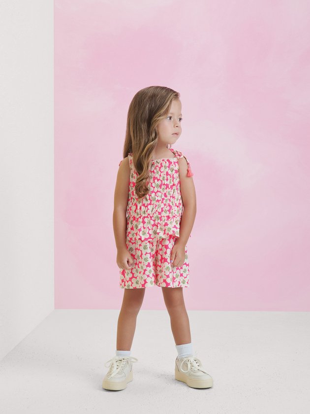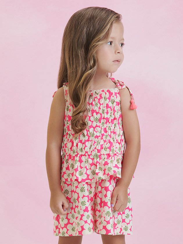 O conjunto rosa neon é uma explosão de estilo e modernidade. Com estampa exclusiva de florezinhas, o conjunto é composto por blusa e short. O elástico no cós do short proporciona conforto e um ajuste perfeito no corpo das meninas. As alças de amarrar da blusa adicionam um toque charmoso ao visual. Esse conjunto é perfeito para criar looks adoráveis para o dia a dia das Animê Lovers. Composição: 100% algodão. Ref.: P5444