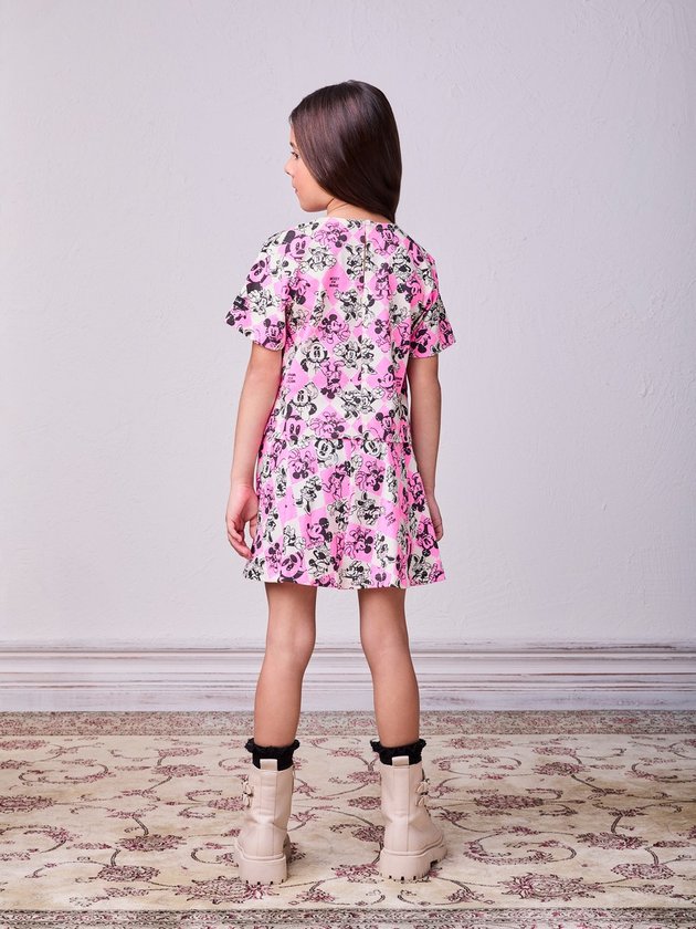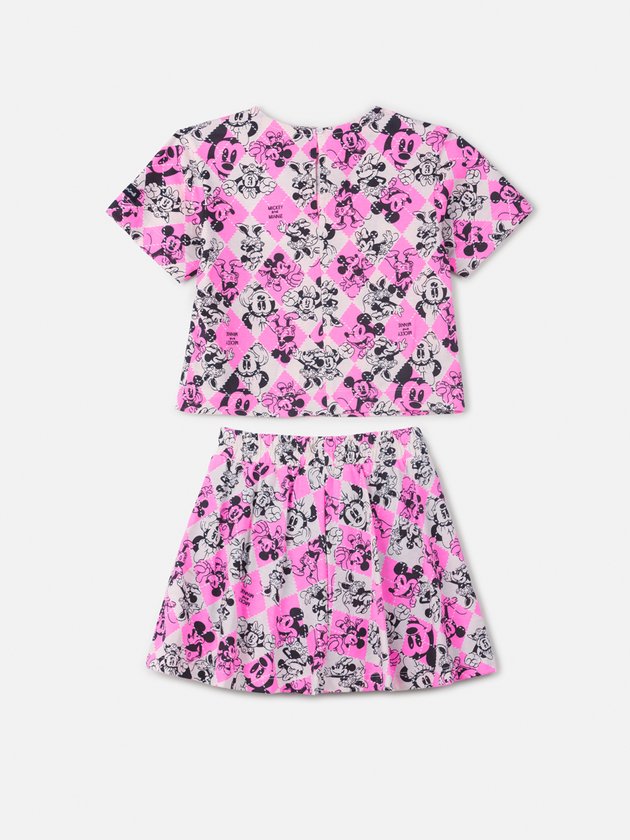 Conjunto fashionista com mood divertido e estampa total dos personagens Disney. A blusa de manga curta ganha destaque com o fundo em padronagem argyle e tons de pink vibrante, enquanto a saia com mesmo print complementa o visual com um shape soltinho e confortável. Um look cool e alegre para as meninas que amam Minnie, Mickey e cia. Ref.: N5145