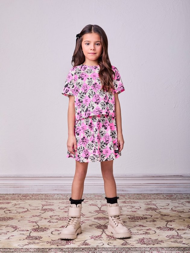 Conjunto fashionista com mood divertido e estampa total dos personagens Disney. A blusa de manga curta ganha destaque com o fundo em padronagem argyle e tons de pink vibrante, enquanto a saia com mesmo print complementa o visual com um shape soltinho e confortável. Um look cool e alegre para as meninas que amam Minnie, Mickey e cia.