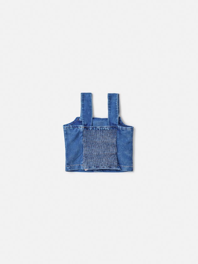 Estiloso e fresquinho, este top cropped adiciona atitude ao visual. Top cropped em jeans azul com alças largas e detalhe franzido na parte frontal central, proporcionando ajuste e textura ao modelo.