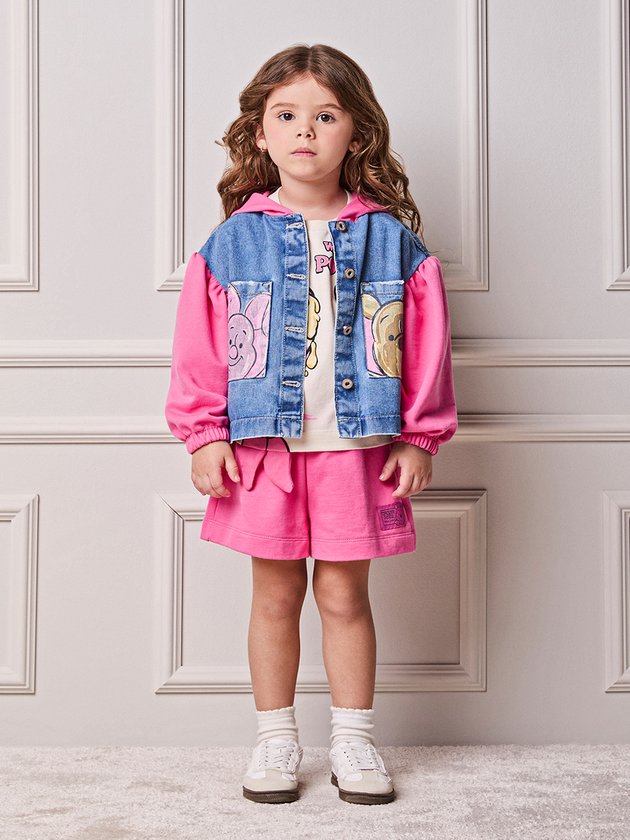 Sobreposição com narrativa. O jeans entra como base clássica e resistente, enquanto mangas e capuz em moletom pink trazem conforto e um contraste visual atual. A presença do Winnie the Pooh aparece de forma carinhosa e estilosa, mantendo leitura sofisticada. A construção equilibra praticidade e design, ideal para o dia a dia com informação de moda. Funciona com vestidos, saias e calças, criando looks despojados com identidade forte e acabamento cuidadoso. Ref.: P6404