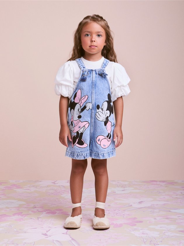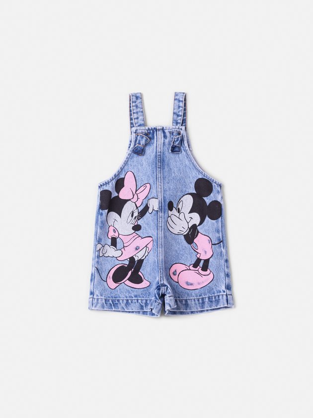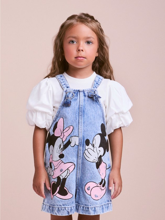 A jardineira jeans Animê ganha charme extra com a estampa frontal do casal mais icônico da Disney: Mickey e Minnie Mouse. Em tons suaves de rosa, os personagens aparecem em um momento divertido e cheio de personalidade, trazendo uma pegada lúdica e fashionista para o guarda-roupa das pequenas. A modelagem prática com alças ajustáveis e fechamento em botões oferece conforto e estilo, ideal para produções casuais e cheias de atitude. Um clássico repaginado para quem ama moda e Disney! Ref.: P6234