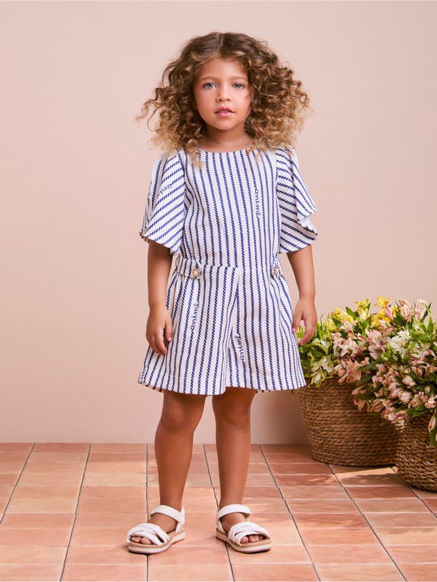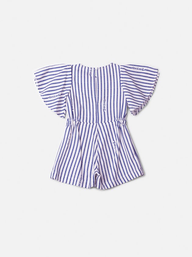 O macacão infantil Animê traz o charme navy em versão super fashion. Confeccionado em tecido leve, apresenta listras azul marinho e brancas em formato de corda, criando uma estampa náutica exclusiva. A modelagem moderna vem acompanhada de mangas soltinhas, cintura marcada com aplicação de pérolas e recorte elegante que valoriza a silhueta. Sofisticado e confortável, é a peça ideal para ocasiões especiais no verão, mantendo o visual fresh e cheio de estilo. Dica: combine com sandálias brancas ou espadrilles para realçar a proposta navy chic.