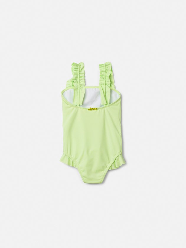 O maiô infantil Animê Minnie Mouse é puro charme para os dias de verão. Confeccionado em tom verde claro super tendência, ele conta com estampa divertida da Minnie usando óculos de coração, transmitindo diversão e estilo. Os detalhes de babadinhos nas alças e na barra adicionam delicadeza ao modelo, que além de fashion, garante conforto e liberdade de movimento para as pequenas. Um verdadeiro must-have do beachwear infantil.