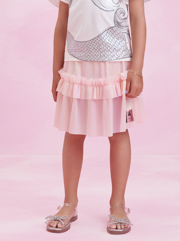Coleção exclusiva em comemoração aos 100 anos da Disney, trouxe peças com visual único e muito brilho. A saia rosa da Animê é pura magia! Feita em tule holográfico, ela brilha com encanto. Possui forro de malha para maior conforto, elástico no cós e babados que adicionam um toque delicado. Com uma etiqueta exclusiva ela é perfeita para compor looks encantadores para o dia a dia das meninas. Composição: 100% poliéster. Forro: 96% algodão e 4% elastano. Ref.: N3880