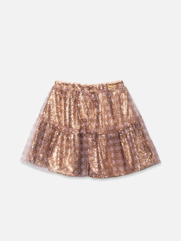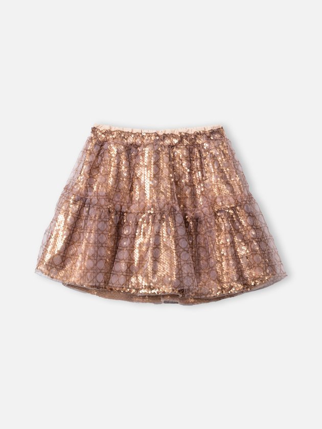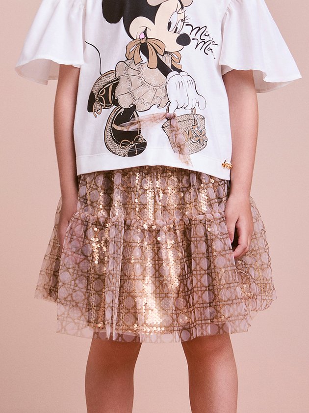 Saia infantil Animê em tule com paetês dourados. Um modelo sofisticado e cheio de brilho, perfeito para looks festivos e fashionistas que encantam mães e filhas. Ref.: N4926