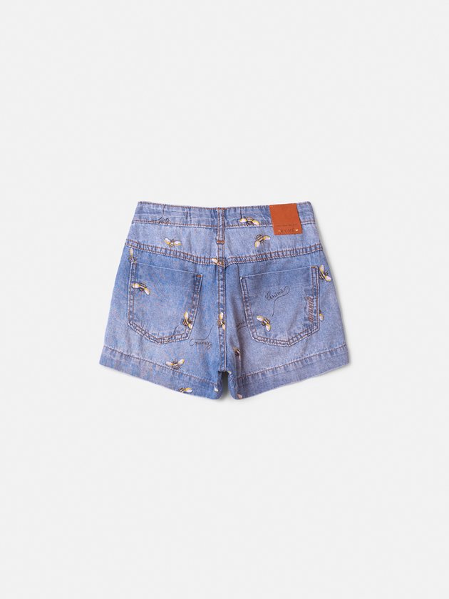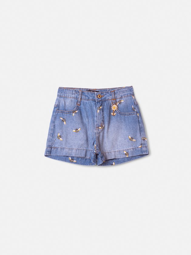 Perfeito para dias ensolarados, este short une estilo e conforto com o DNA fashion da Animê. Shorts jeans femininos com estampa de pequenas abelhas espalhadas por toda a peça. Possui cós com passantes para cinto, fechamento por botão e bolso frontal com chaveiro de flor.