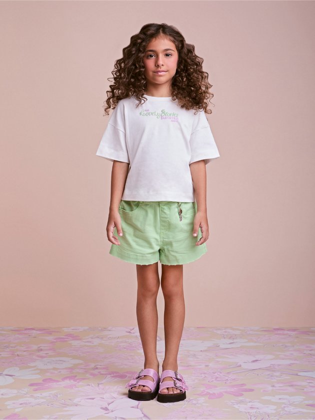 Casual e fashion na medida certa, o short verde em sarja macia surpreende pelo pingente de óculos exclusivo, que dá um toque divertido ao visual. Os bolsos e o cós confortável garantem praticidade para os dias de brincadeira com muito estilo. Ref.: N5012