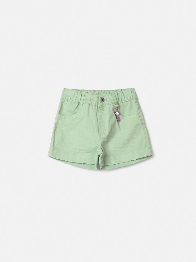 Perfeito para dias ensolarados, este short une estilo e conforto com o DNA fashion da Animê. Shorts femininos em tom verde claro, confeccionados em tecido leve, com cintura com elástico, bolsos frontais, fechamento por botão e detalhe de pingente roxo anexado ao cós.