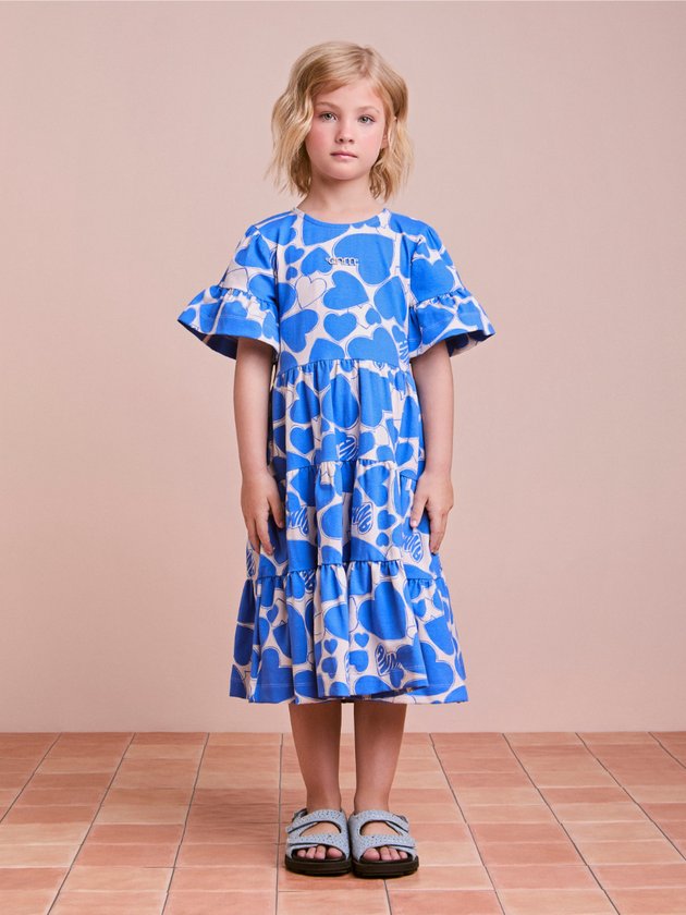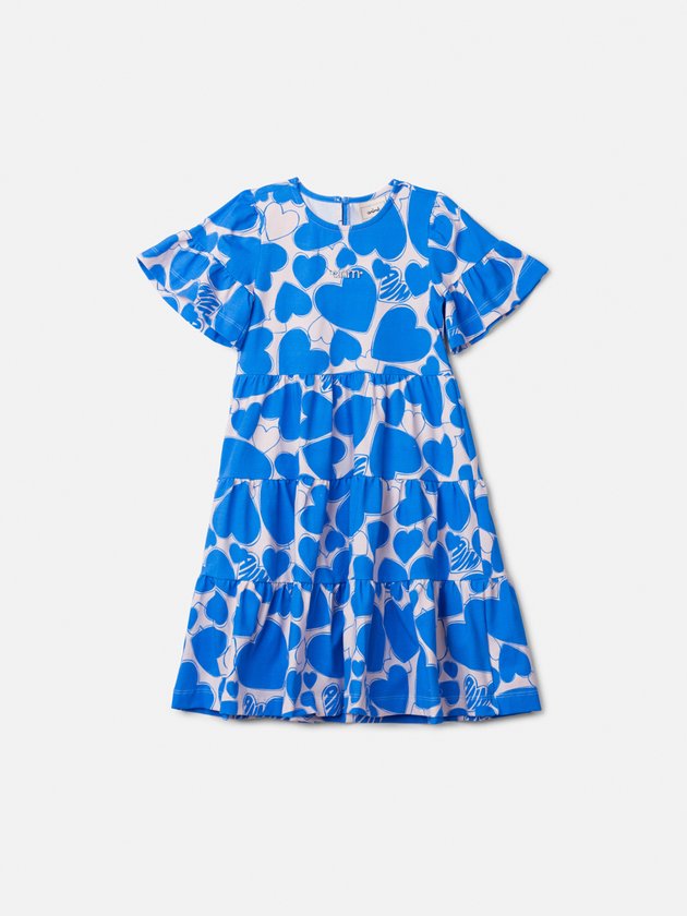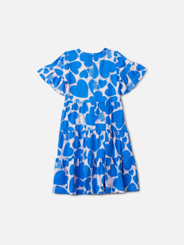 Com uma proposta leve e sofisticada, este vestido traduz o verão em forma de moda. Vestido com estampa de corações azuis sobre um fundo branco, com mangas curtas e babados na saia em três camadas, apresentando um estilo leve e descontraído.