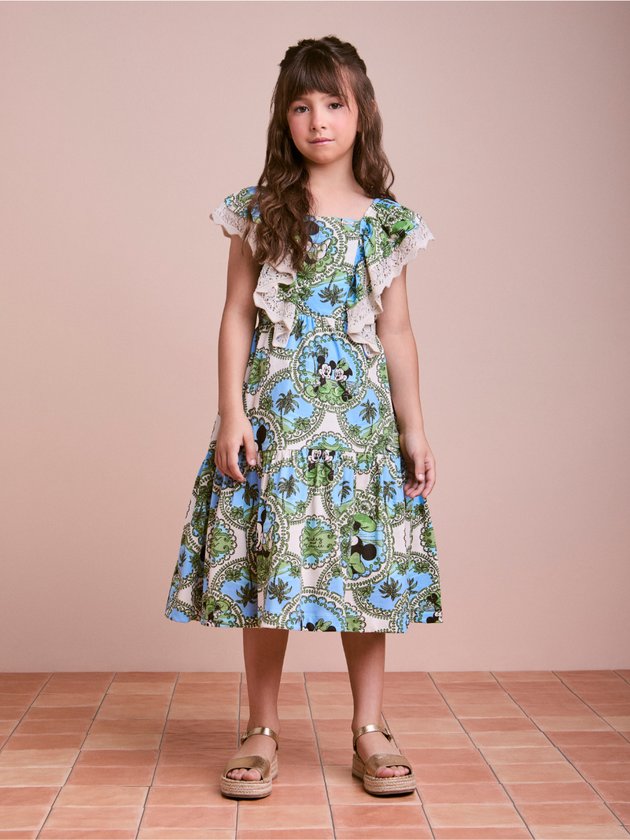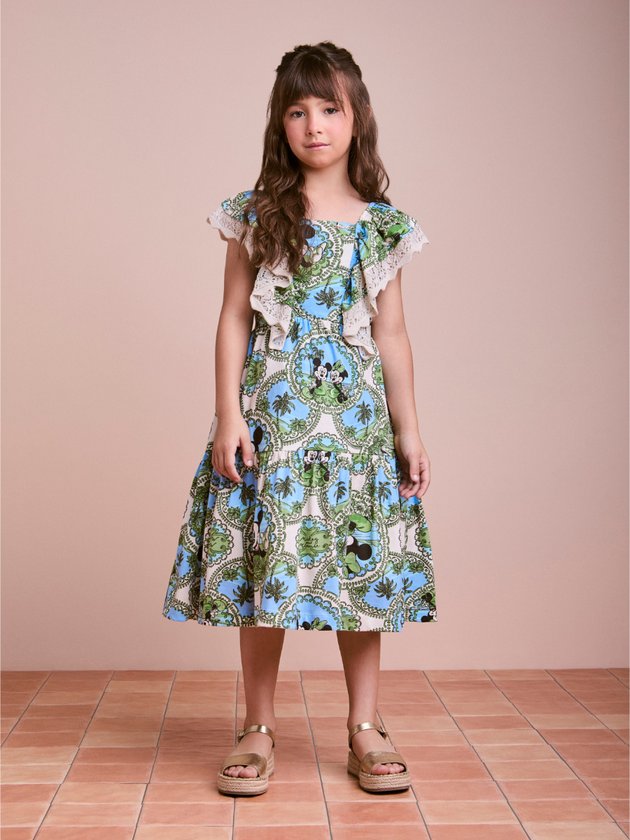 Com uma proposta leve e sofisticada, este vestido traduz o verão em forma de moda. Vestido com estampa divertida e colorida, apresentando figuras do Mickey e Minnie em círculos decorativos verdes e azuis. Possui babados amplos nas alças com acabamento em renda creme, e uma saia rodada com leve volume. O tecido aparenta ser leve, adequado para uso confortável em climas mais quentes.