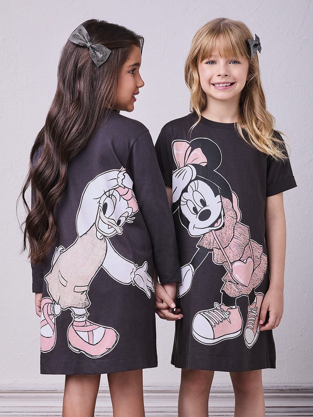 A Minnie mais fashion que você já viu! O vestido preto traz a personagem em um mood divertido e glam, com detalhes em rosa claro e aplicação que iluminam o look. A peça perfeita para brilhar em qualquer ocasião.