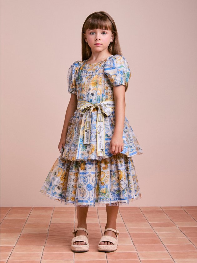 Com estampa rotativa em tons delicados e tule sobreposto, este vestido é pura poesia. A faixa na cintura cria um laço charmoso que valoriza a silhueta baby, enquanto os babadinhos e a transparência suave garantem um toque de fantasia ao visual. Ref.: N5035