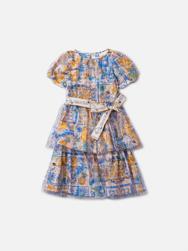 Com uma proposta leve e sofisticada, este vestido traduz o verão em forma de moda. Vestido curto com estampa vibrante e detalhada que combina elementos florais, frutas e arabescos em tons de azul, amarelo e bege. Possui mangas bufantes transparentes e saia com duas camadas de tecido leve, criando um visual esvoaçante. A peça é complementada por um cinto de tecido com detalhes escritos que realça a cintura.
