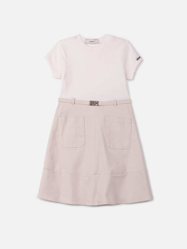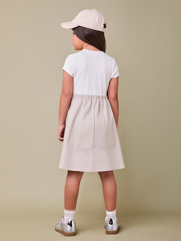 Chic sem esforço: o vestido bicolor simula um conjunto, com parte superior tipo t-shirt e saia estruturada com cinto ANM. Em tons neutros, ele combina com tudo e traz um ar preppy moderno ao look.