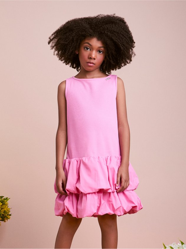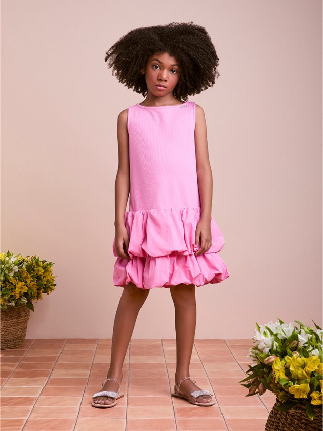 O vestido Animê em tom rosa é puro charme para os dias de verão. A parte superior em malha canelada garante conforto e caimento perfeito, enquanto a saia com babados volumosos traz movimento e um ar romântico ao look. Versátil e delicado, é ideal para festas, passeios ou momentos especiais que pedem estilo sem abrir mão da praticidade. Combine com sandálias metalizadas para um visual encantador e moderno.
