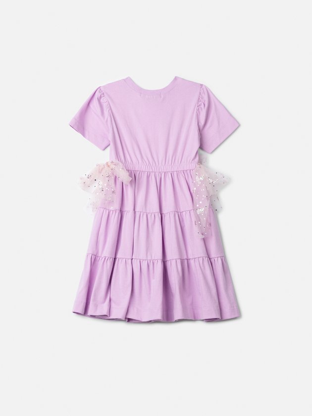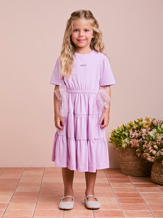 Delicado e cheio de estilo, este vestido Animê em malha lilás garante conforto e elegância para as pequenas fashionistas. O modelo conta com mangas curtas, cintura levemente marcada e saia em camadas que traz leveza ao visual. O destaque fica por conta dos laços laterais em tule bordado com glitter, que dão um toque lúdico e sofisticado. Perfeito para passeios e ocasiões especiais, ele combina conforto e charme na medida certa. Dica: finalize com sandália metalizada ou tênis branco para um look fresh e moderno.