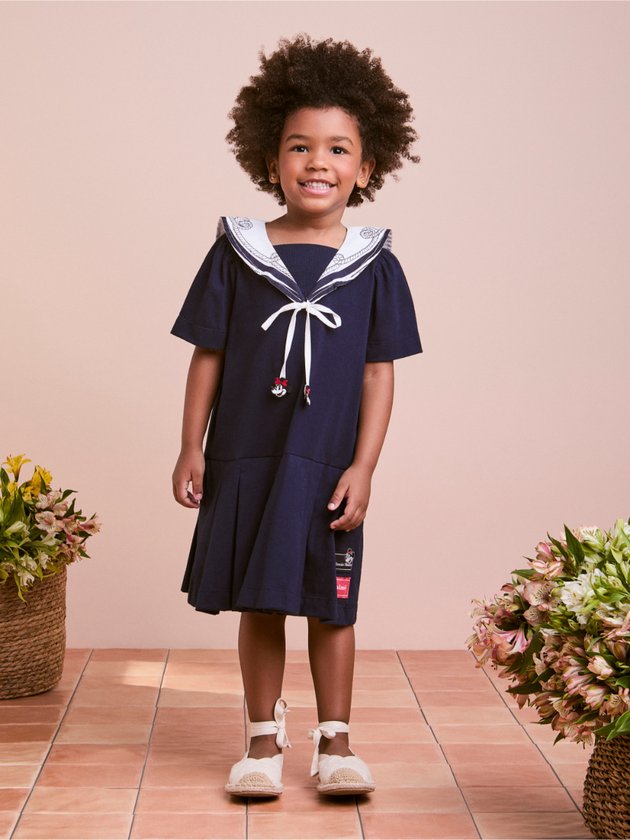 O vestido Animê Disney traz todo o encanto da Minnie em uma proposta navy sofisticada. Em tom azul marinho, o modelo possui gola marinheiro com estampa de cordas, laço com ponteiras divertidas da Minnie e barra levemente plissada que garante movimento ao look. Moderno e confortável, é ideal para momentos especiais, passeios em família ou eventos de verão. Aposte em sandálias brancas ou sapatilhas para completar o visual com ainda mais estilo.