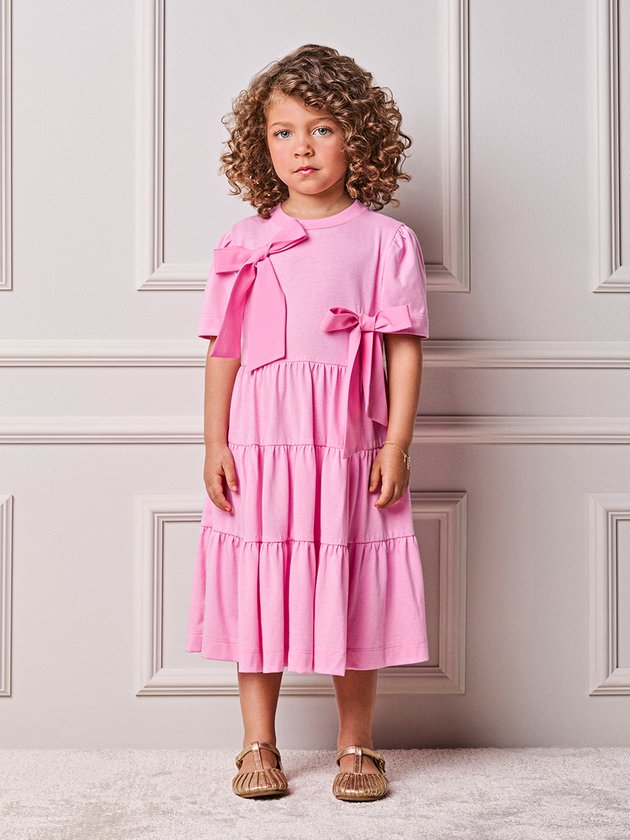 Delicadeza com impacto visual. O rosa baby traz suavidade, enquanto as marias franzidas criam volume e movimento elegante. Os máxi laços aparecem como protagonistas, adicionando charme e uma leitura fashion marcante. A construção equilibra romantismo e sofisticação, com caimento confortável e visual bem estruturado. Ideal para eventos, fotos e momentos especiais, é um vestido que traduz feminilidade contemporânea, com atenção aos detalhes e acabamento refinado. Ref.: P6435
