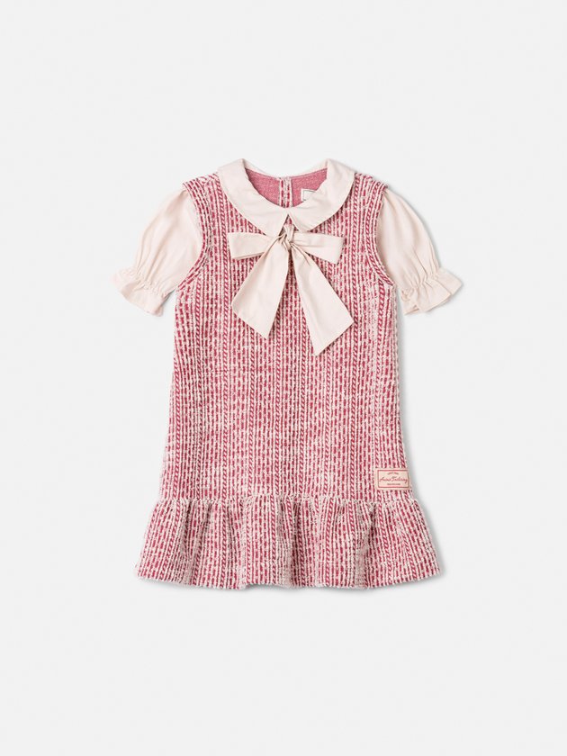 Vestido de Tweed Cherry com Manga Bufante e Gola Boneca com Máxi Laço