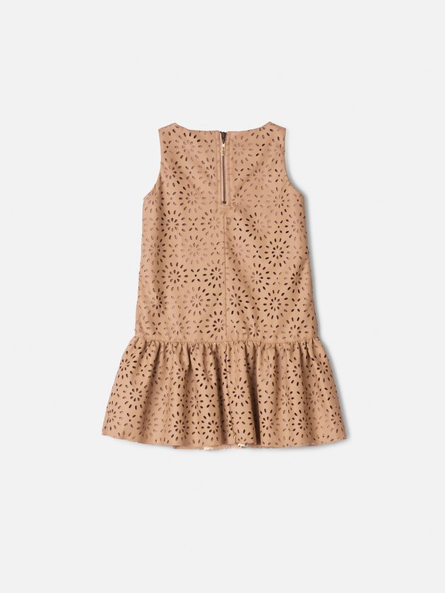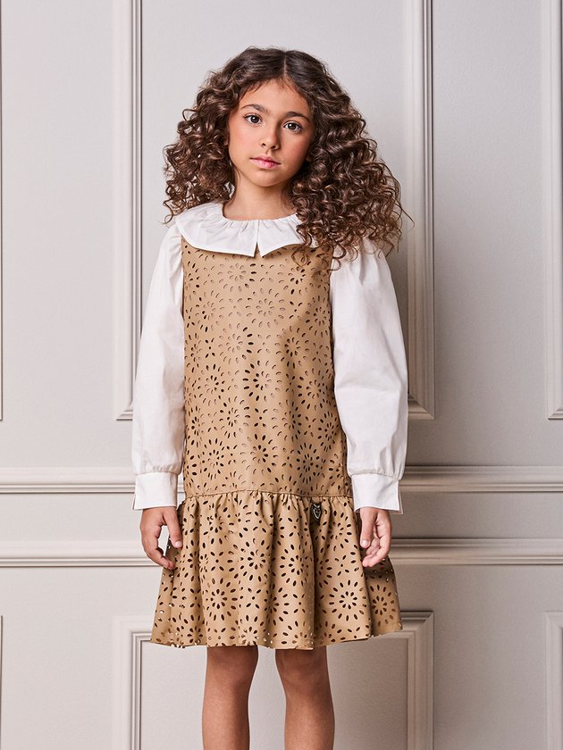 Este vestido traduz uma elegância contemporânea de leitura imediata. A construção reta no corpo cria uma base limpa e sofisticada, enquanto o desenho vazado floral percorre toda a superfície com precisão gráfica, revelando um trabalho de recorte minucioso que valoriza textura, luz e profundidade. O barrado levemente franzido adiciona movimento controlado à silhueta, equilibrando estrutura e fluidez com naturalidade. A gola fechada reforça a proposta refinada, mantendo o visual alinhado e atemporal. O tom neutro potencializa a versatilidade da peça e evidencia o desenho do material, tornando cada detalhe protagonista. O acabamento impecável e a aplicação metálica assinada finalizam a composição com identidade e presença. Uma peça de impacto discreto, pensada para quem reconhece sofisticação nos detalhes e valoriza design bem executado. Ref.: N5432