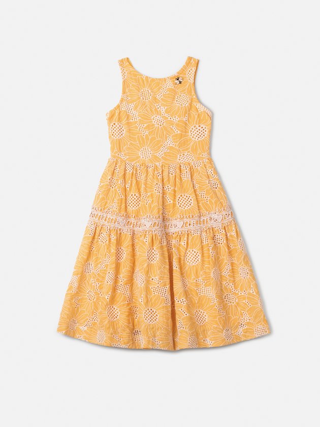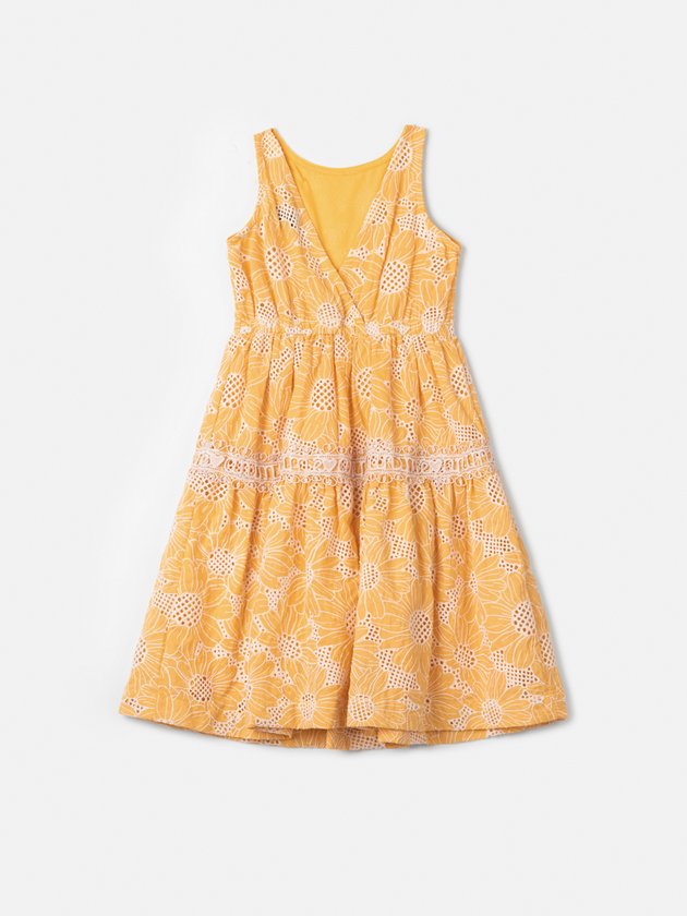 Com uma proposta leve e sofisticada, este vestido traduz o verão em forma de moda. Vestido infantil sem mangas, com estampa de flores grandes e detalhes em renda branca que decoram a saia. O vestido possui um corte ajustado no busto e saia franzida, proporcionando leveza e movimento. A cor predominante é amarelo, com detalhes florais em branco, conferindo um visual alegre e fresco.