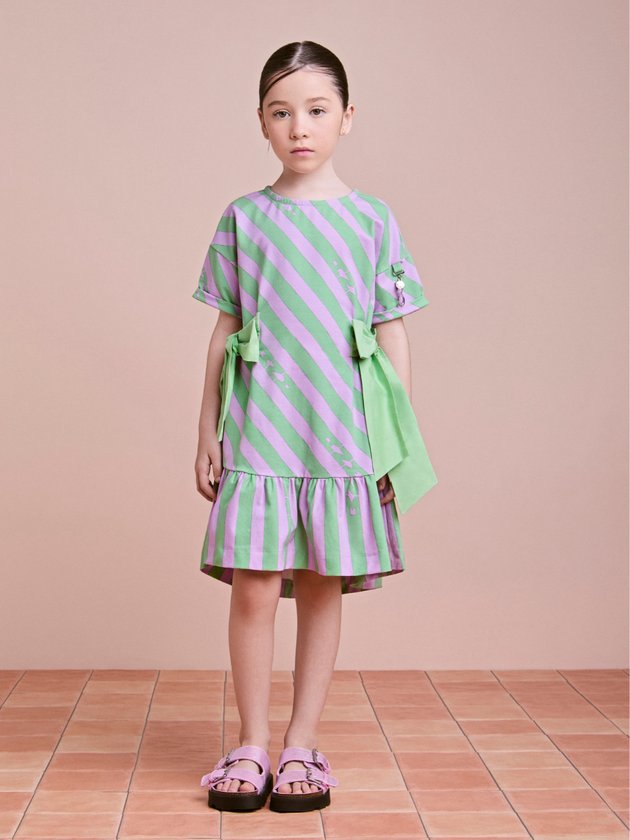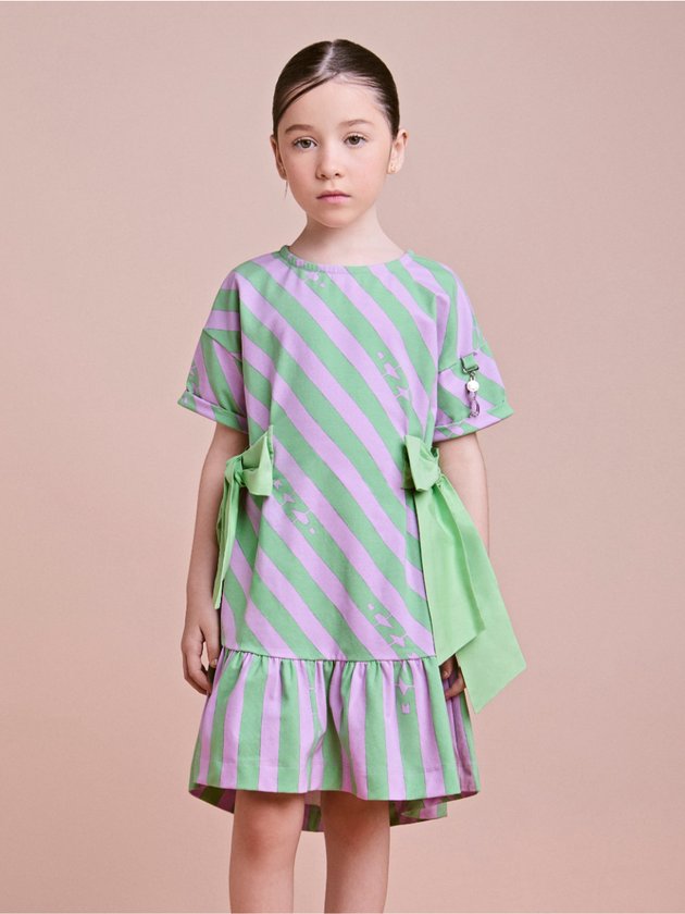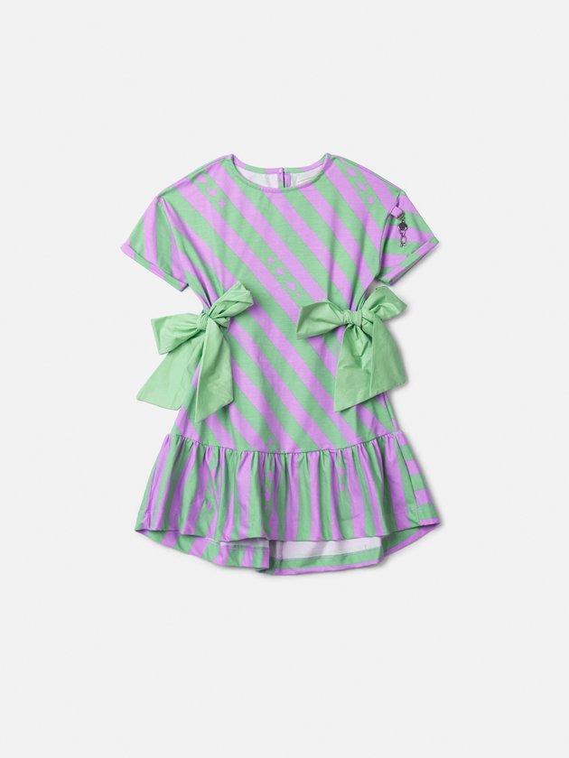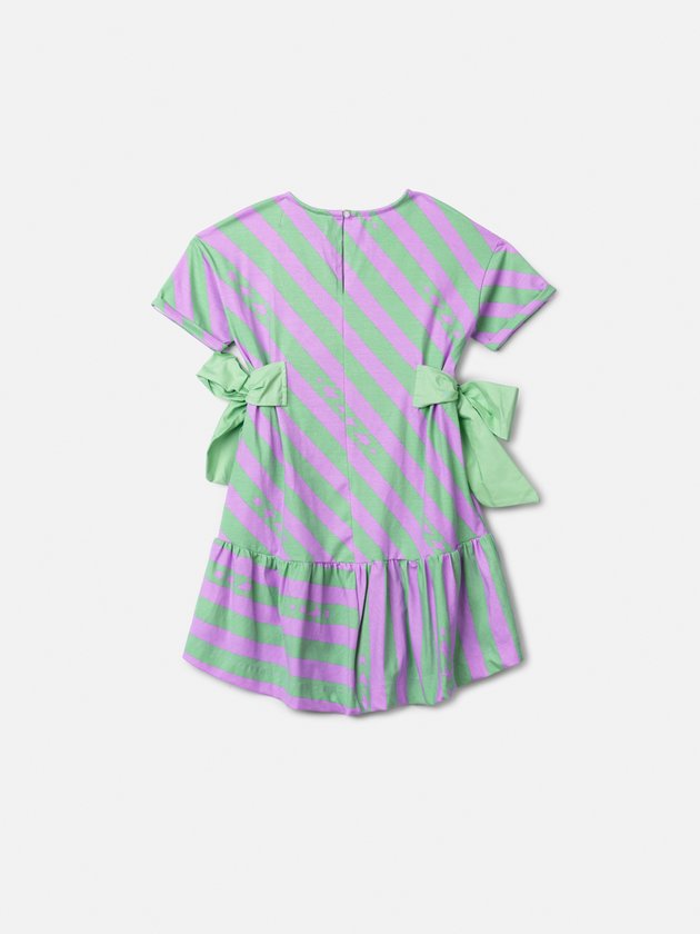 Com uma proposta leve e sofisticada, este vestido traduz o verão em forma de moda. Vestido curto com mangas curtas e saia com babado. Possui estampa listrada diagonal em verde e lilás. Apresenta dois laços grandes laterais na cintura na mesma cor verde das listras. O fechamento fica na parte de trás com um botão no pescoço.